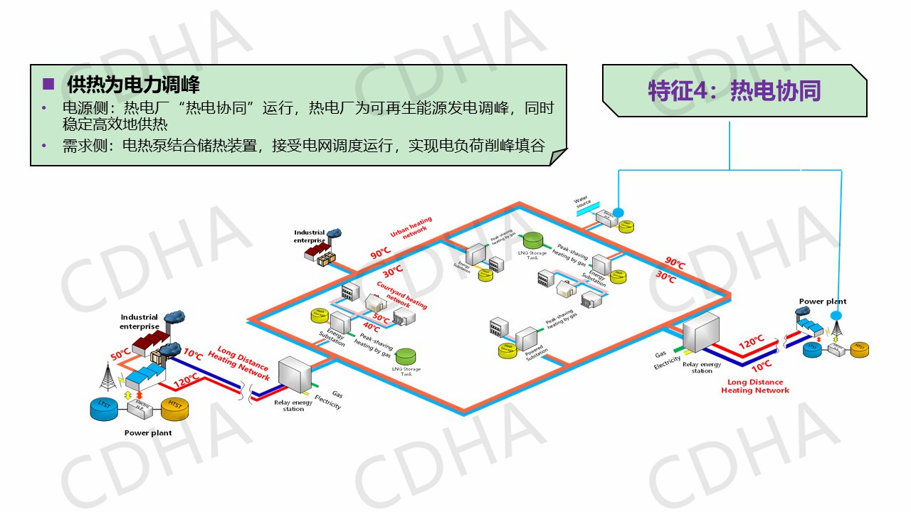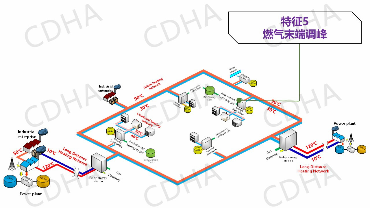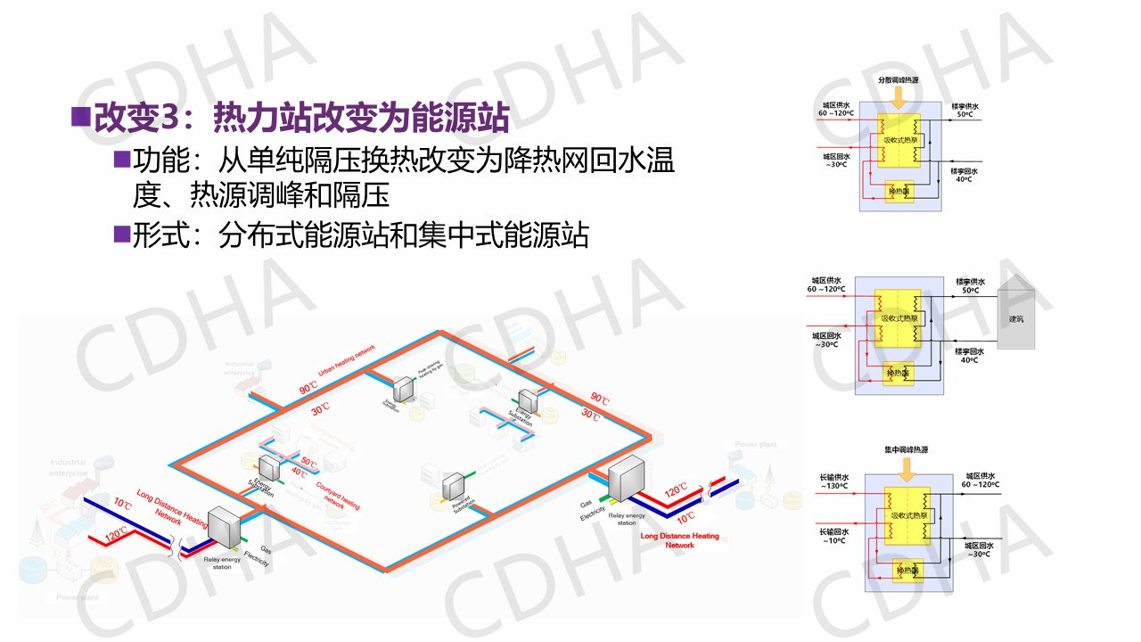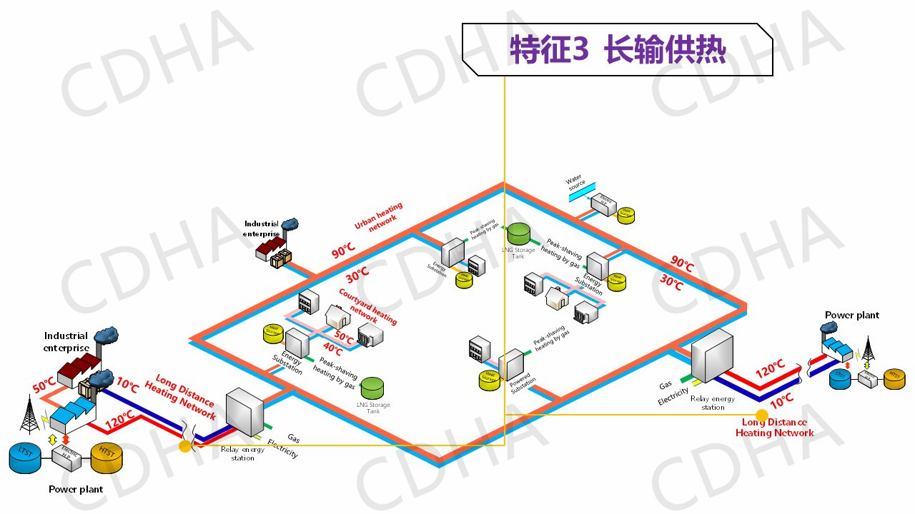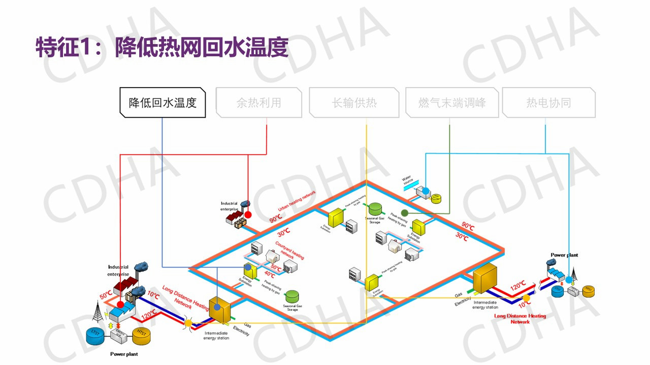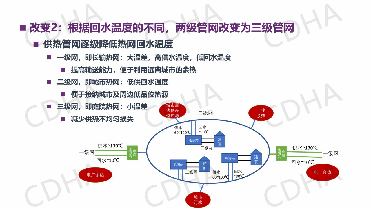 那么這些特征我說完之后,我想把它再進一步的歸納總結(jié)到系統(tǒng)里邊,城市里面這種供熱系統(tǒng)該是什么樣的,該有哪些改變?我們總結(jié)了四點,也就是說以余熱為主的、低品位的熱源取代燃煤為主的鍋爐,這是我們熱源的一個改變。第二個改變,我們要增設(shè)像儲熱、儲氣和熱泵等設(shè)施,實現(xiàn)熱電氣協(xié)同。第三個改變,我們要建立以實現(xiàn)降低回水溫度為主要目標的能源站。第四個改變,由于我們增加了長輸管網(wǎng),從參數(shù)上我們是三級系統(tǒng),而不是過去的二級管網(wǎng)。