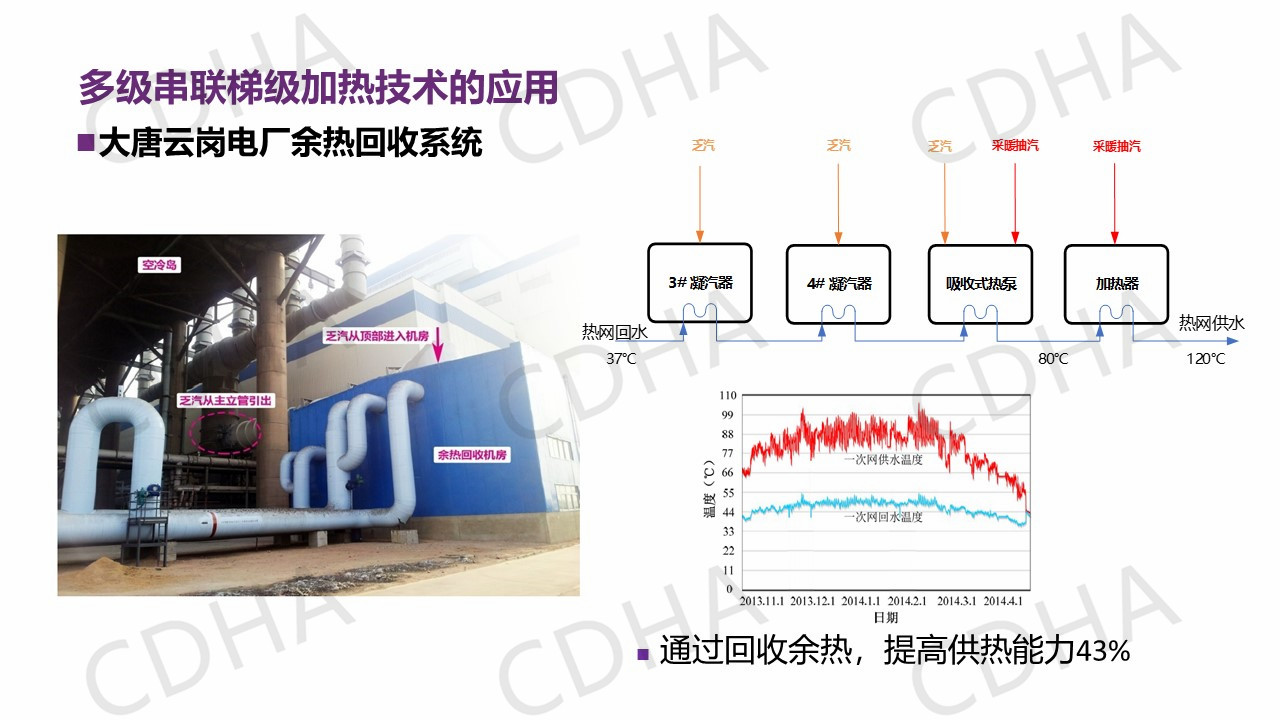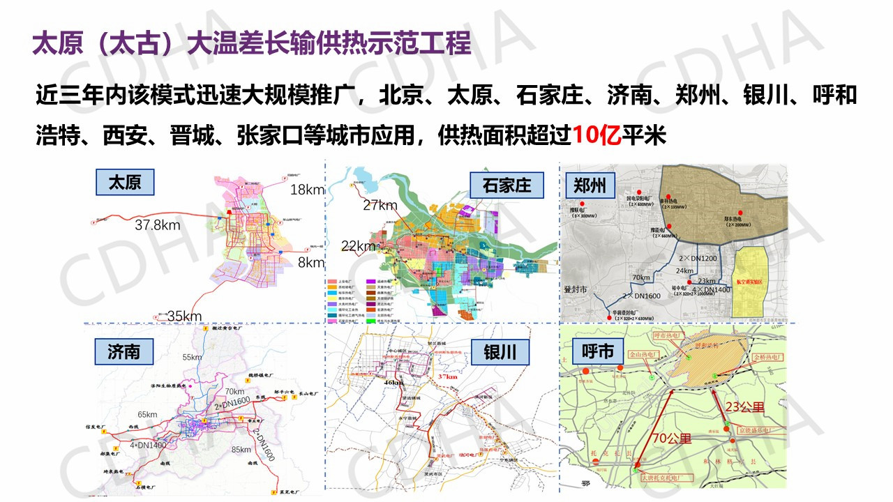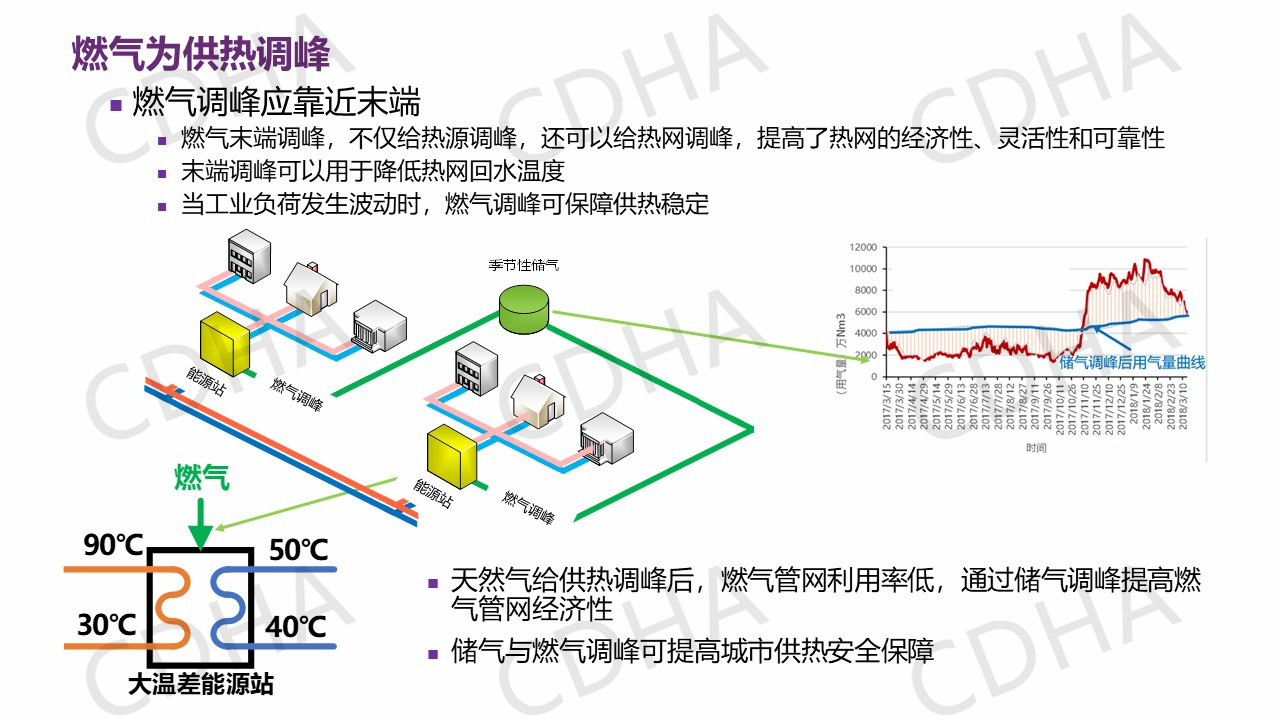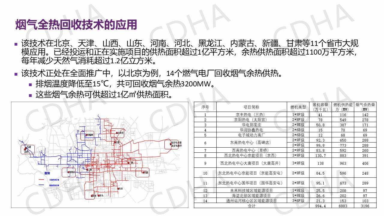我要介紹的最后一個是效果。因為以電廠余熱和工業(yè)余熱為主的能源供熱,用不到10%的燃氣做調(diào)峰,對比一下它的效果就是能耗比鍋爐可以下降90%,污染排放降低90%,而它的成本和燃煤鍋爐相當,不到天然氣的一半。