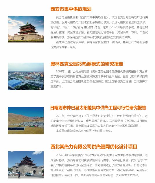 立足北京,面向全國(guó),公司的工程項(xiàng)目遍及內(nèi)蒙古、西藏、遼寧等近二十個(gè)省、市、自治區(qū)。在全國(guó)業(yè)界,公司是熱力行業(yè)國(guó)家標(biāo)準(zhǔn)、規(guī)范、圖集的重要編制單位、供熱技術(shù)進(jìn)步的重要推動(dòng)者,為各地政府和供熱企業(yè)提供咨詢?cè)O(shè)計(jì)服務(wù)。