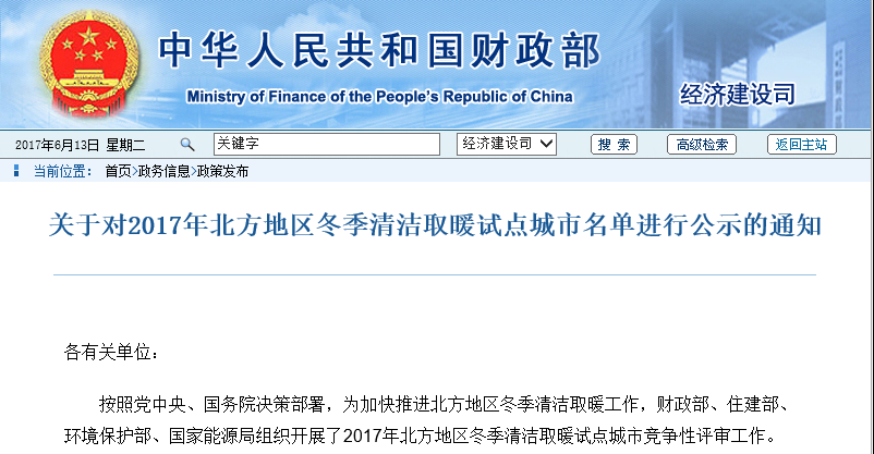 按照黨中央、國(guó)務(wù)院決策部署,為加快推進(jìn)北方地區(qū)冬季清潔取暖工作,財(cái)政部、住建部、環(huán)境保護(hù)部、國(guó)家能源局組織開(kāi)展了2017年北方地區(qū)冬季清潔取暖試點(diǎn)城市競(jìng)爭(zhēng)性評(píng)審工作。