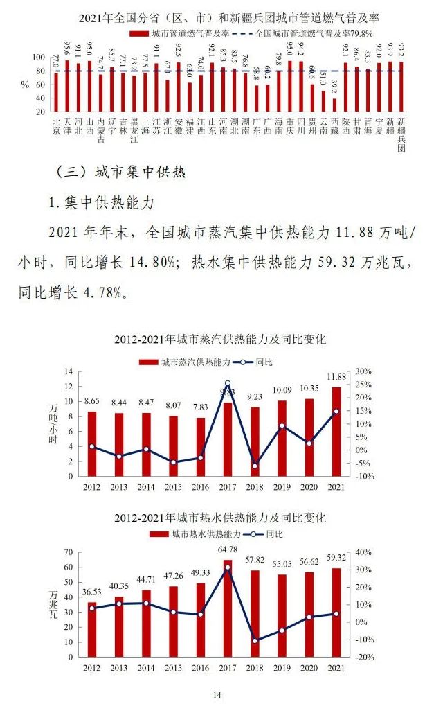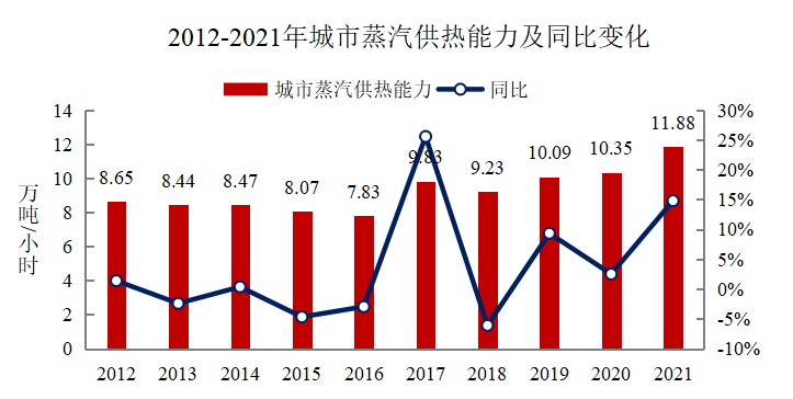 住房和城鄉(xiāng)建設(shè)部發(fā)布《2021年中國(guó)城市建設(shè)狀況公報(bào)》。《公報(bào)》顯示,2021年年末,全國(guó)城市蒸汽集中供熱能力11.88萬(wàn)噸/小時(shí),同比增長(zhǎng)14.80%;熱水集中供熱能力59.32萬(wàn)兆瓦,同比增長(zhǎng)4.78%。