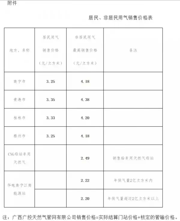 按照上下游價格聯(lián)動政策規(guī)定,降低南寧等4個城市居民用氣和非居民用氣最高銷售價格,以及廣西華電南寧江南分布式能源站、CNG母站車用天然氣銷售價格,各地和用戶的具體價格詳見附件。非居民用氣可在最高價格幅度內(nèi),由供需雙方協(xié)商制定具體價格。