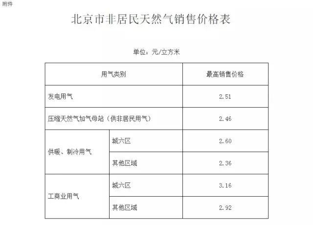 一、本市管道天然氣非居民銷售價格實施區(qū)域差別價格政策。其中:城六區(qū)供暖、制冷用氣最高銷售價格調(diào)整為2.60元/立方米,工商業(yè)用氣調(diào)整為3.16元/立方米;其他區(qū)域供暖、制冷用氣調(diào)整為2.36元/立方米,工商業(yè)用氣調(diào)整為2.92元/立方米。全市發(fā)電用氣調(diào)整為2.51元/立方米,壓縮天然氣加氣母站(供非居民用氣)調(diào)整為2.46元/立方米。