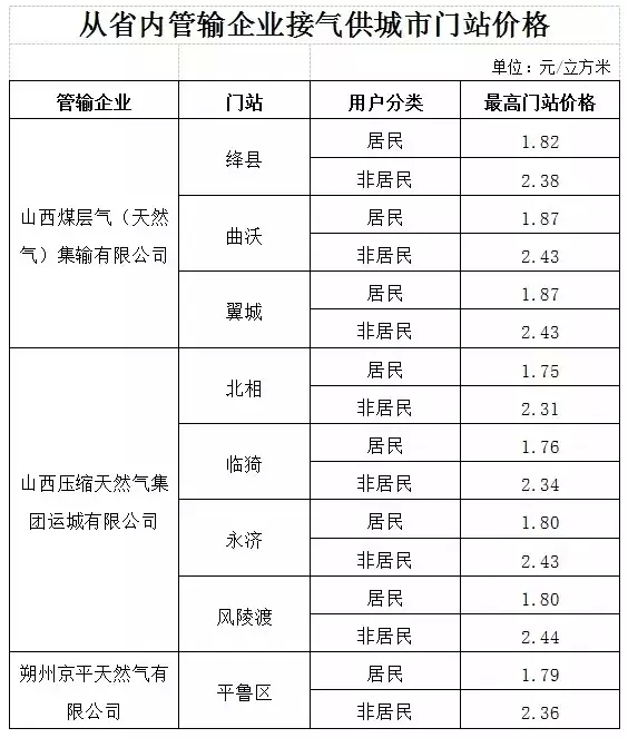 ?。ǘ┚用裼锰烊粴忾T站價格不作調(diào)整。省內(nèi)管輸企業(yè)供各市居民門站價格不作調(diào)整。2013年7月國家天然氣價格改革方案實施后新增通氣城市居民用氣門站價格,按照不高于當(dāng)?shù)胤蔷用裼脷忾T站價格執(zhí)行。