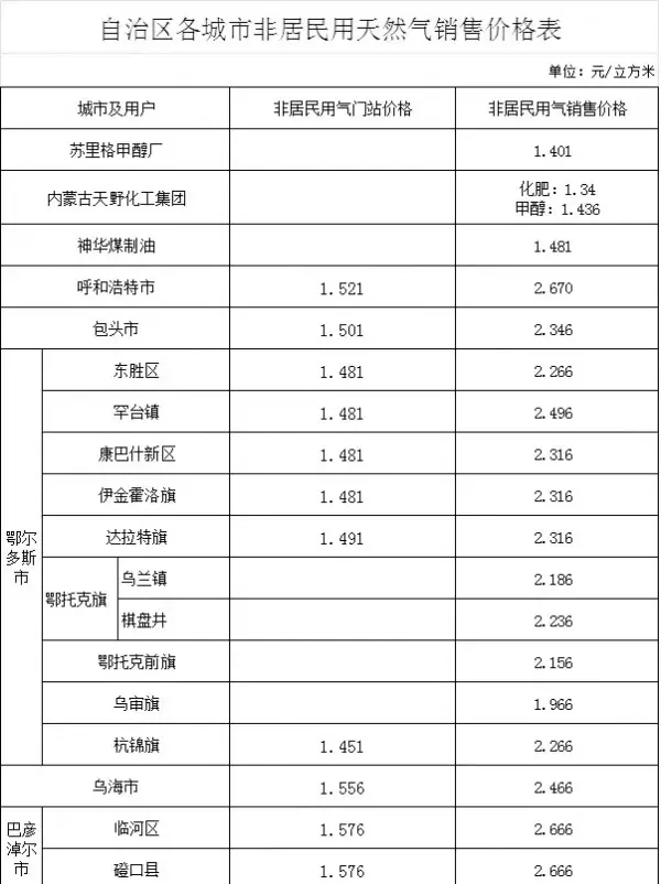 附件:自治區(qū)各城市非居民用天然氣銷售價格表