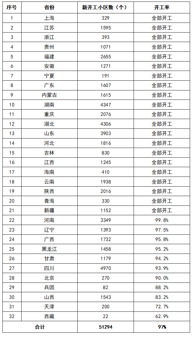2023年,全國(guó)計(jì)劃新開(kāi)工改造城鎮(zhèn)老舊小區(qū)5.3萬(wàn)個(gè)、涉及居民865萬(wàn)戶。根據(jù)各地統(tǒng)計(jì)上報(bào)數(shù)據(jù),1-9月份,全國(guó)新開(kāi)工改造城鎮(zhèn)老舊小區(qū)5.13萬(wàn)個(gè)、惠及居民851萬(wàn)戶,按小區(qū)數(shù)計(jì)開(kāi)工率97%。分省看,上海、江蘇、浙江、貴州、福建、安徽、寧夏、廣東、內(nèi)蒙古、湖南、重慶、湖北、山東、河北、吉林、江西、海南、云南、陜西、青海、新疆等21個(gè)省份全部開(kāi)工。