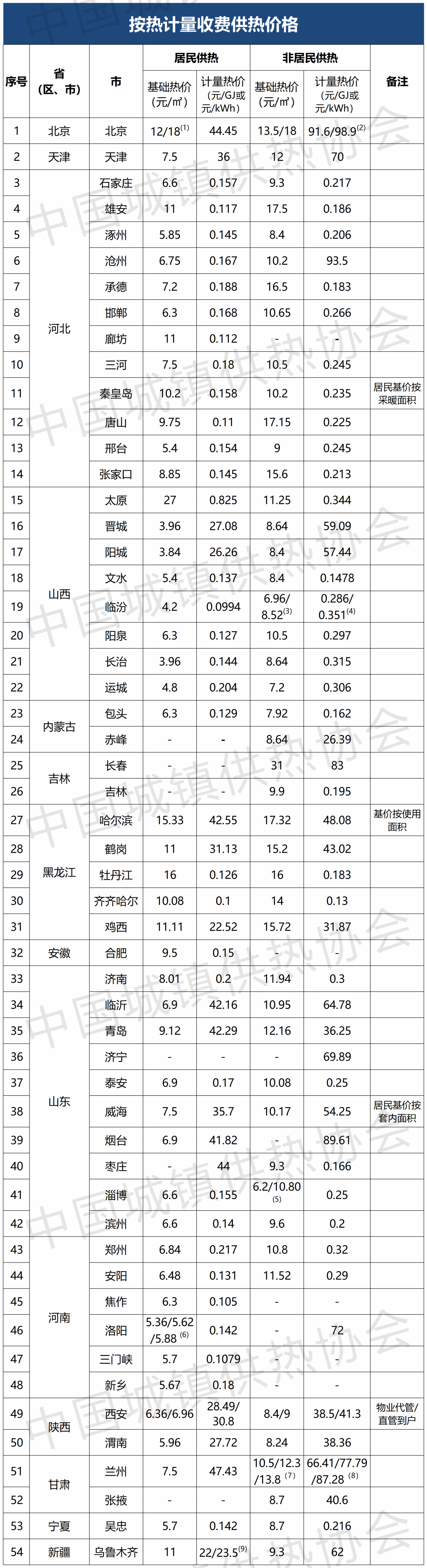 本文根據(jù)協(xié)會(huì)2025年度統(tǒng)計(jì)數(shù)據(jù)整理,若無特別說明,表中居民供熱價(jià)格和非居民供熱價(jià)格均為按建筑面積收費(fèi)的價(jià)格。
