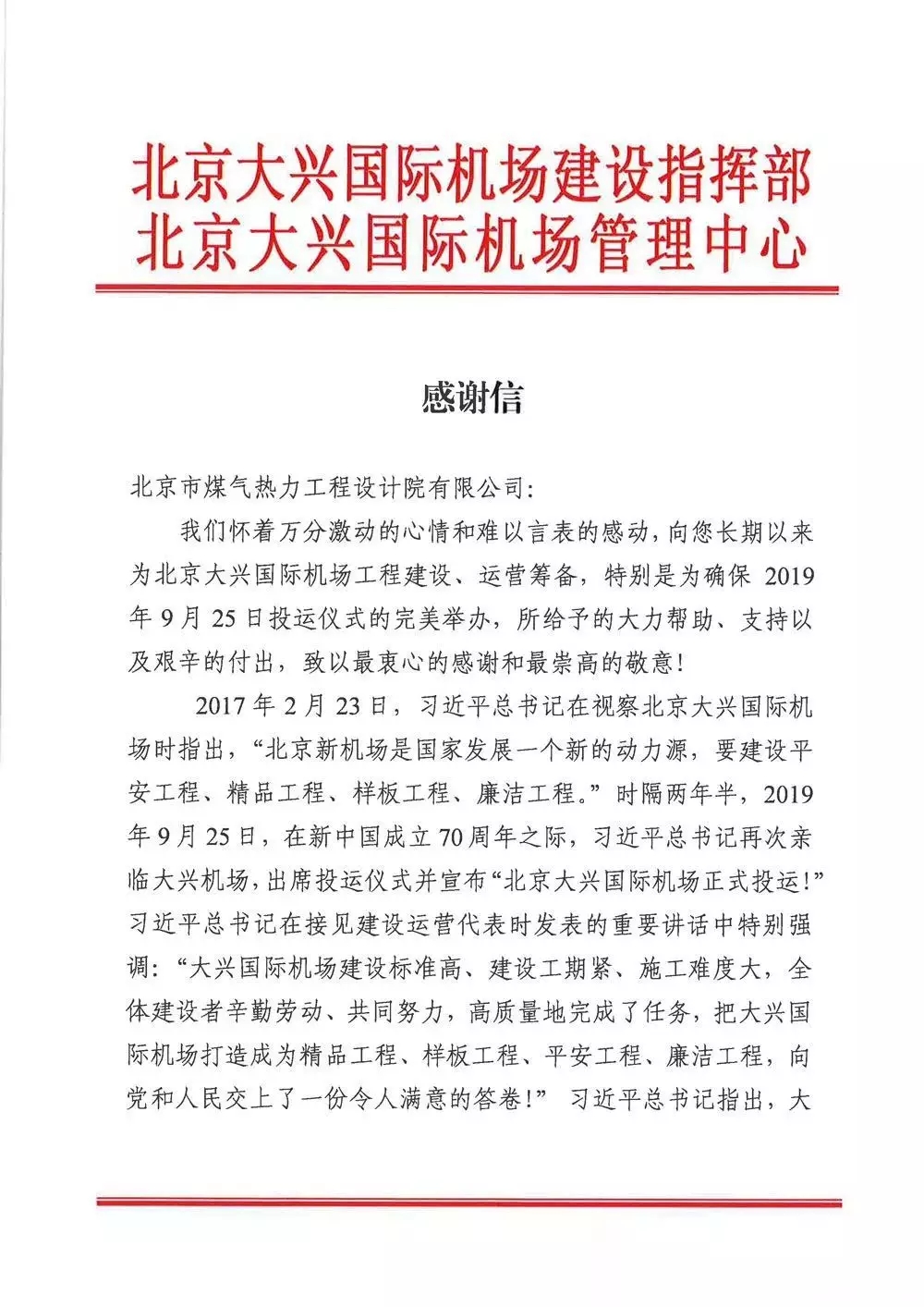 4.煤熱院:收到北京大興國際機場感謝信