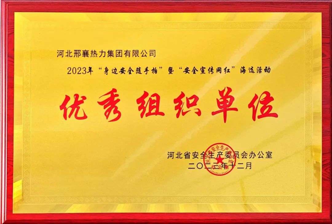 與此同時(shí),河北省安全生產(chǎn)委員會(huì)辦公室發(fā)布的《關(guān)于公布“身邊安全隨手拍”暨“安全宣傳網(wǎng)紅”海選活動(dòng)獲獎(jiǎng)名單的通知》,河北邢襄熱力集團(tuán)有限公司獲評(píng)“2023年度優(yōu)秀組織單位”稱號(hào)。