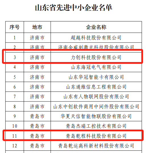 7.力創(chuàng)科技、青島乾程科技:入選山東省先進(jìn)中小企業(yè)