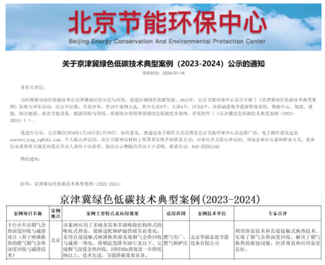 1月16日,北京節(jié)能環(huán)保中心公布了2023-2024年京津冀綠色低碳技術(shù)典型案例的評(píng)審結(jié)果,北京華源泰盟節(jié)能設(shè)備有限公司申報(bào)的豐臺(tái)火車站煙氣余熱深度回收與減排項(xiàng)目位列其中。