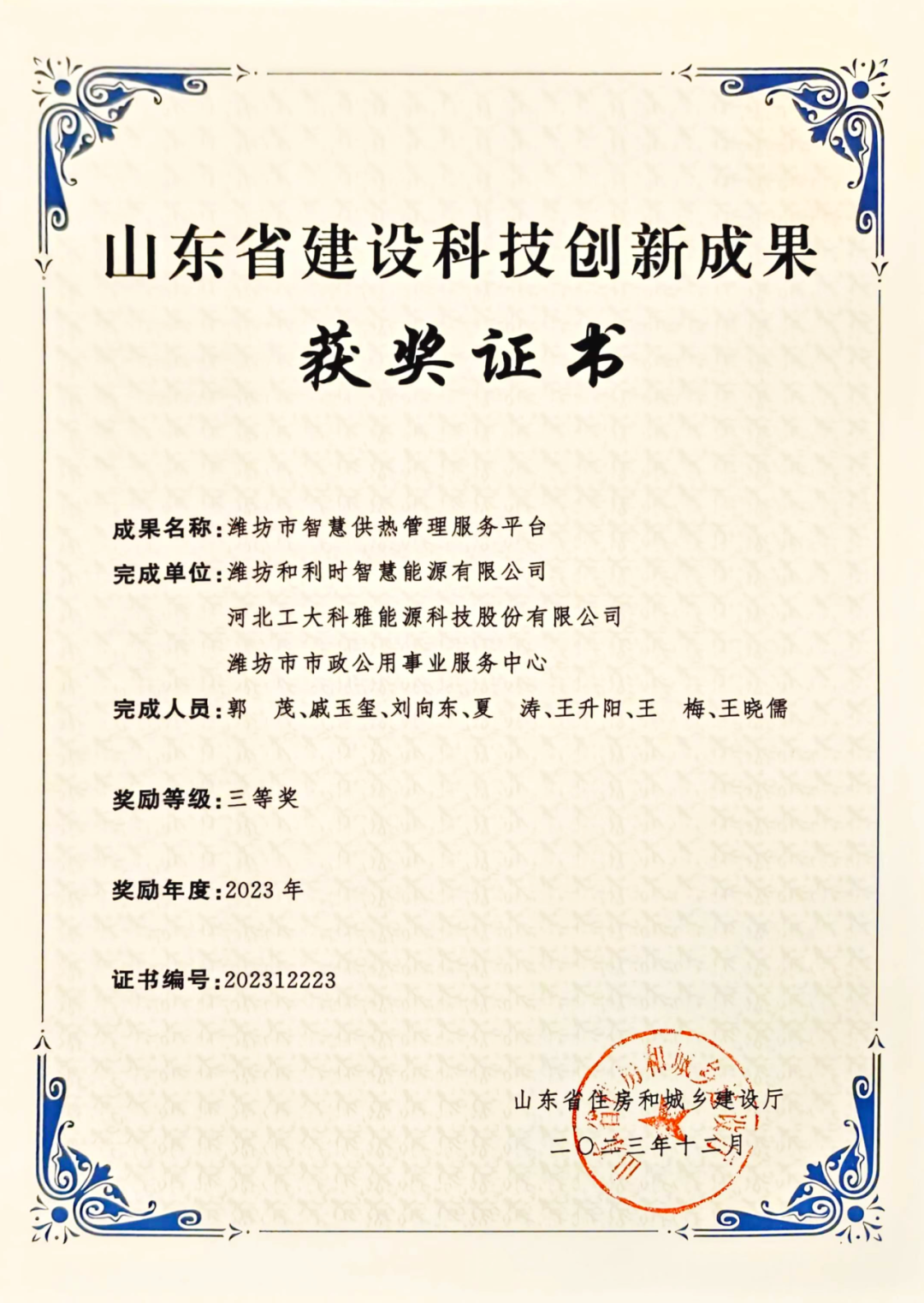 2023年度山東省建設(shè)科技創(chuàng)新成果評(píng)選結(jié)果公布,工大科雅與濰坊和利時(shí)智慧能源有限公司、濰坊市市政公用事業(yè)服務(wù)中心聯(lián)合完成的《濰坊市智慧供熱管理服務(wù)平臺(tái)》創(chuàng)新成果榮獲三等獎(jiǎng)。