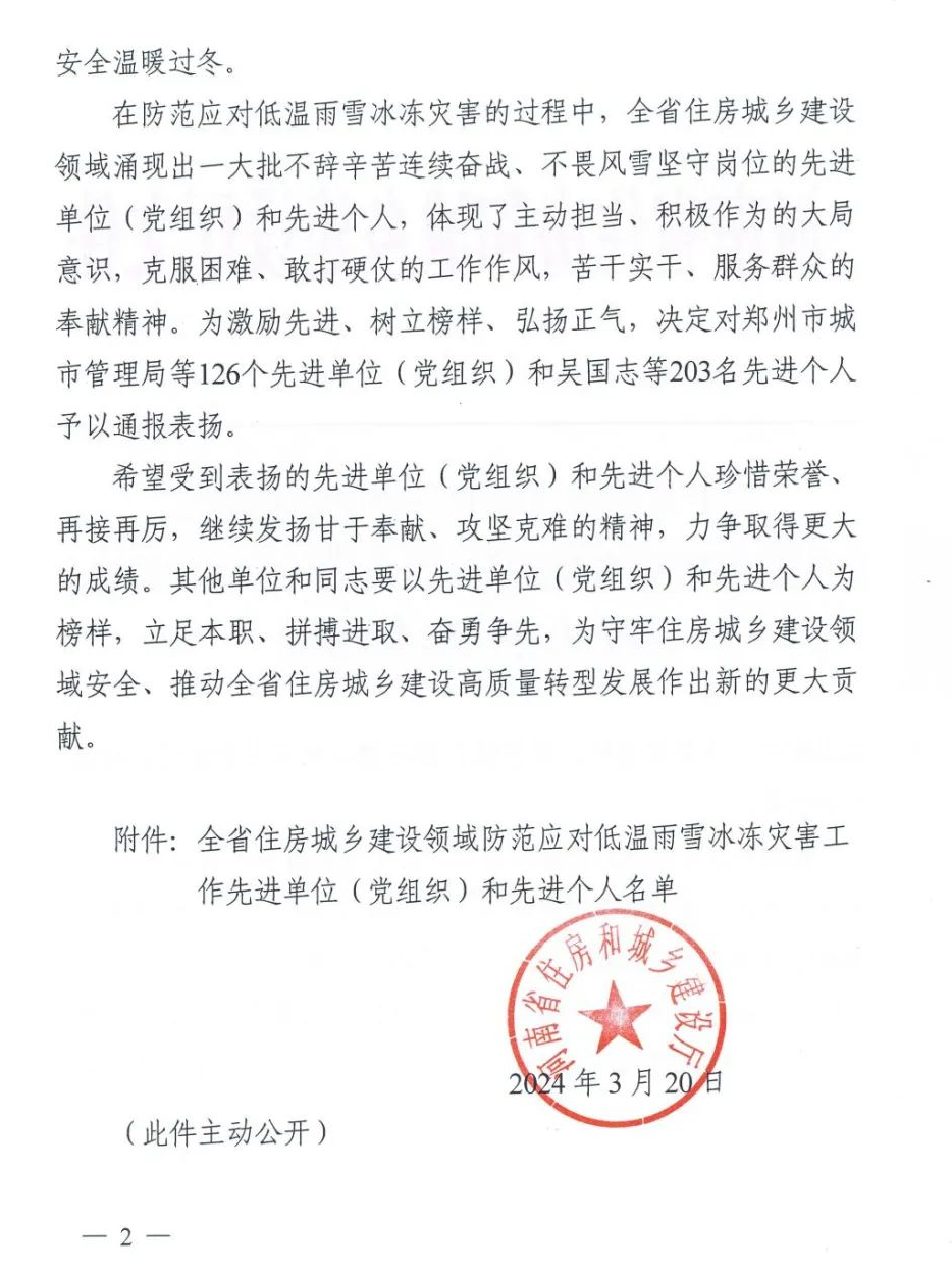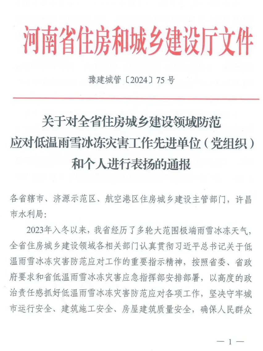 3月20日,河南省住房和城鄉(xiāng)建設廳發(fā)布了《關(guān)于對全省住房城鄉(xiāng)建設領(lǐng)域防范應對低溫雨雪冰凍災害工作先進單位(黨組織)和個人進行表揚的通報》,表彰全省在低溫雨雪冰凍災害的過程中表現(xiàn)出色的先進單位和個人,洛陽熱力集團有限公司受到表彰。