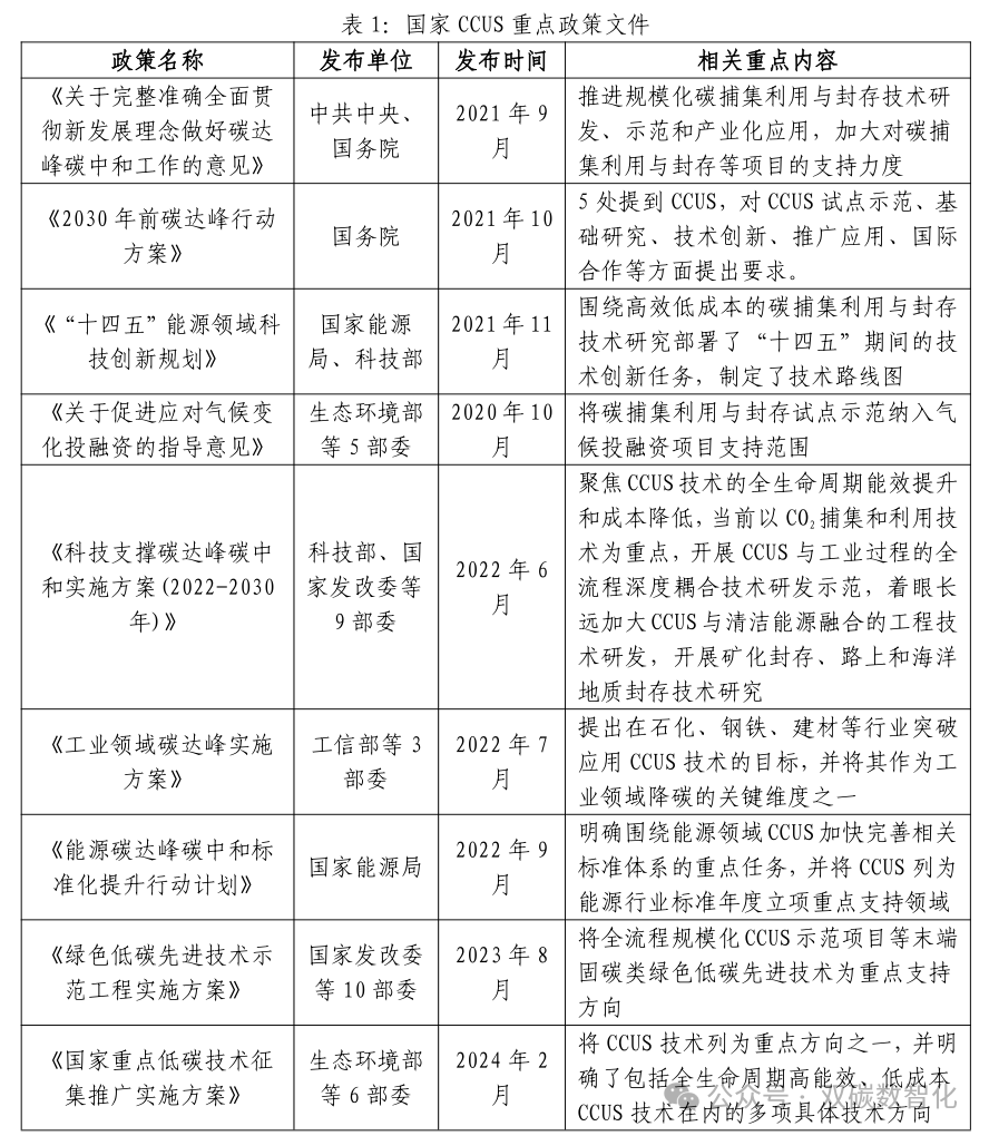 2020年9月碳達峰碳中和目標提出后,國家各部委和地方政府先后出臺相關政策文件,對CCUS 技術研發(fā)、標準和融資等方面作出積極部署,逐步推動 CCUS 技術的研發(fā)和規(guī)模化應用。截至目前,我國已發(fā)布的CCUS 相關政策文件涵蓋發(fā)展規(guī)劃、技術標準、試驗示范、技術目錄等方面,CCUS 政策體系初具雛形。重點政策如下: