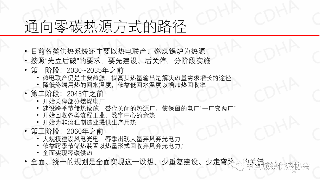 所以我們考慮是分三個階段,每個階段的主要任務(wù)是不一樣的。第一階段比如說到達(dá)峰之前,這些年電廠什么的還沒撤,過了達(dá)峰才往下降。那么這時候最主要的是做好準(zhǔn)備工作,做什么?兩條,最主要是把回水溫度降下來?,F(xiàn)在隨著經(jīng)濟(jì)發(fā)展,各地還都說熱源不夠,有的要再上火電廠,有的要上燃料鍋爐房,這事矛盾比較大。