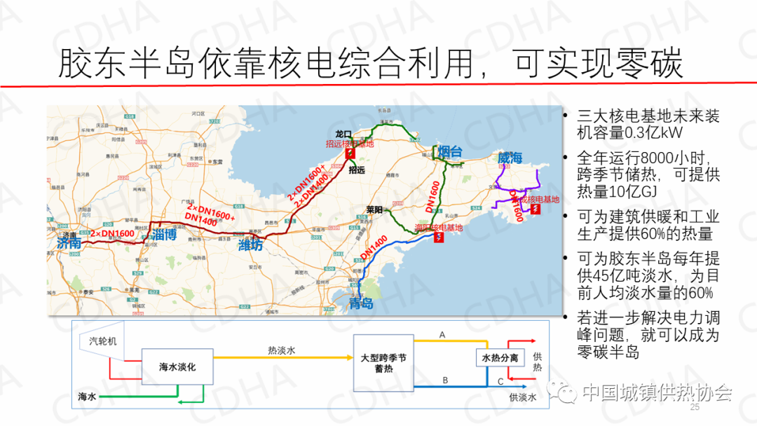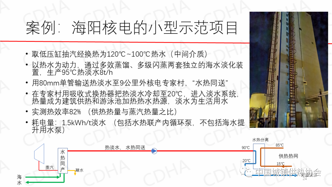 海陽核電的余熱,弄出100多℃的熱水,然后拿它做動力,做這個海水淡化,把海水做出95℃的熱淡水來,然后這一根管給送到居民家采暖,收拾完了那邊就出涼水,這涼水人家愛喝,這水也沒味,也挺好喝,比他們自來水好喝。