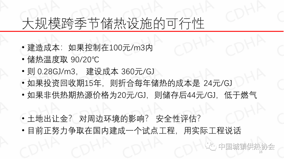 不算土地出讓金,這個事100元每立方米應(yīng)該能做出來。如果我們努力讓這100塊錢一立方米這事給他做成,儲熱溫度是90℃/20℃的話,那樣一立方米就能出0.28GJ的熱量,建設(shè)成本360塊錢1GJ,如果投資是15年,每年儲熱成本是24塊錢1GJ。比燃?xì)獾倪€便宜。這樣通過儲熱(可以)替代燃?xì)猓沁@個(計算)沒有包括土地出讓金,它屬于是國家政策的事兒。