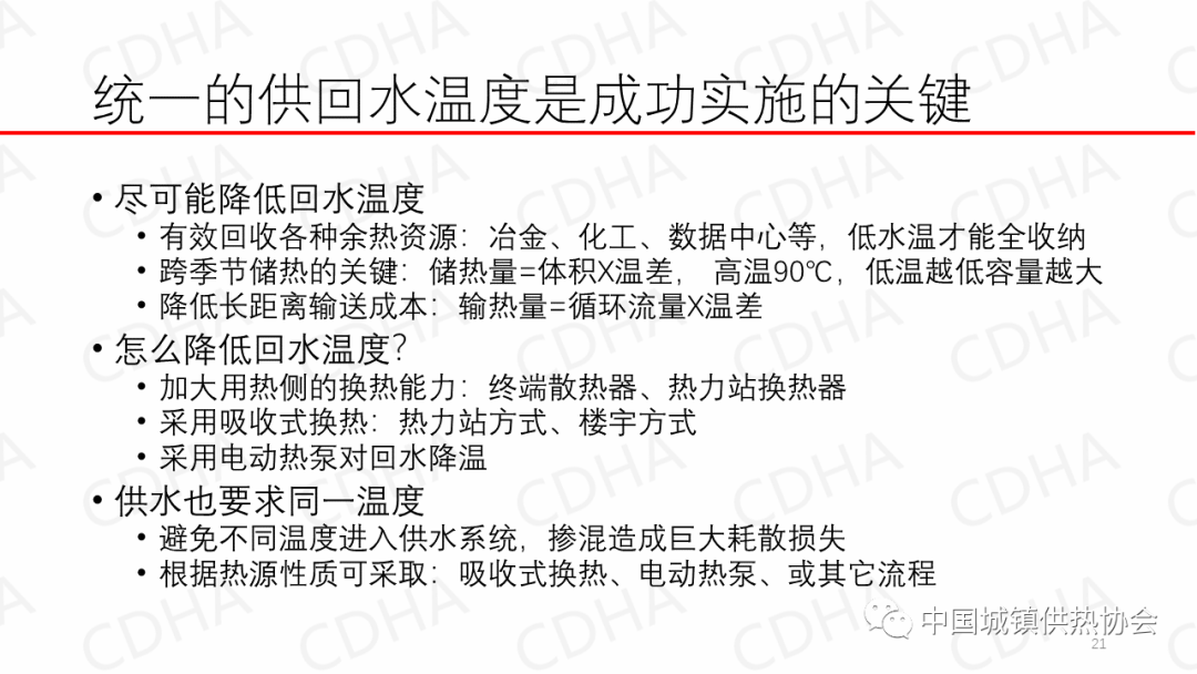 那么要想干好這事兒,統(tǒng)一供回水溫度是成功的關(guān)鍵,尤其是把回水溫度降低,降低回水溫度,別以為說就是為了解決輸送問題,首先把回收溫度降低,才可以有效的回收各種余熱資源,水溫越低,收的熱量比例越高。