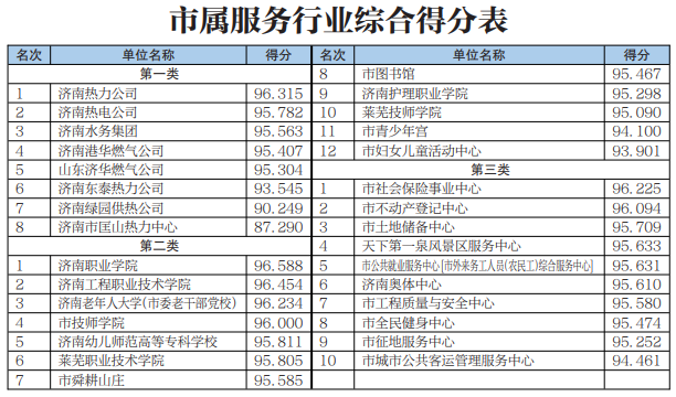 近日,濟(jì)南市通報(bào)了2020年度黨風(fēng)政風(fēng)行風(fēng)正風(fēng)肅紀(jì)民主評議工作情況。群眾代表、企業(yè)代表、黨代表、人大代表、政協(xié)委員、社會監(jiān)督員、干部職工等11類評議主體對9個(gè)類別200余個(gè)參評單位進(jìn)行了評議。在市屬服務(wù)行業(yè)(第一類)中,濟(jì)南熱力集團(tuán)以96.315的總分位列第一名,濟(jì)南熱電公司以95.782的總分位列第二名。