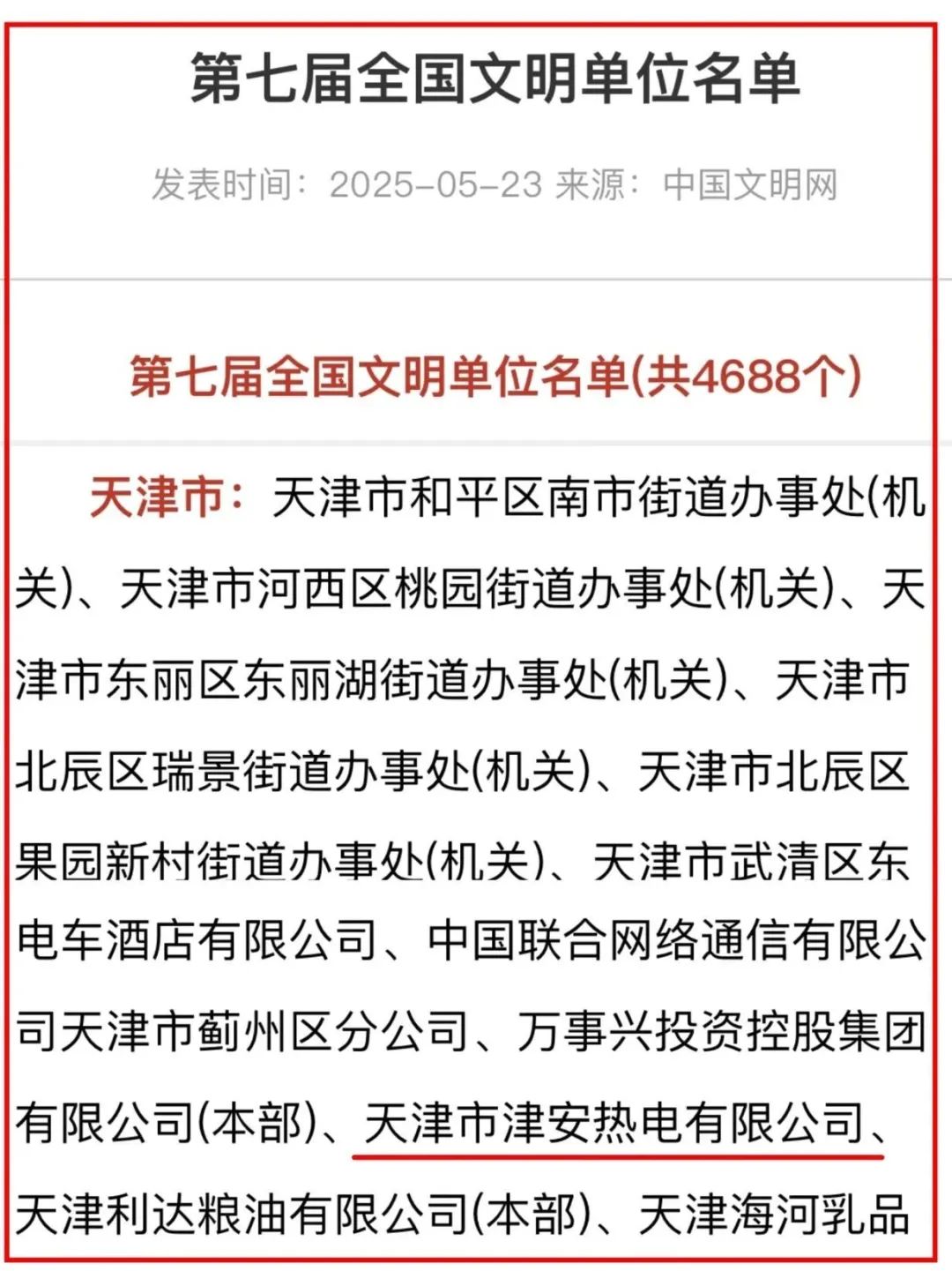 5月23日召開的全國精神文明建設表彰大會上,天津能源集團津安熱電公司榮獲第七屆“全國文明單位”稱號。