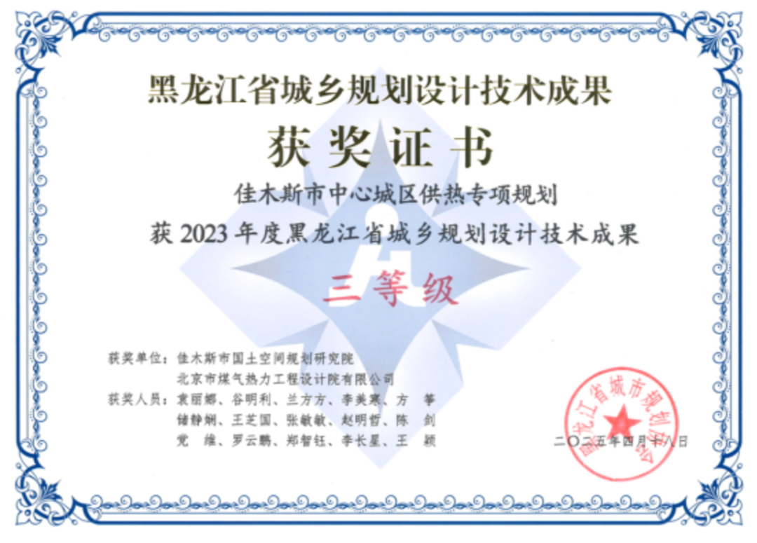由煤熱院編制的《佳木斯市供熱規(guī)劃(2024-2035年)》榮獲2023年度黑龍江省城鄉(xiāng)規(guī)劃設計技術成果三等獎。煤熱院通過技術、經(jīng)濟比較,確定最優(yōu)方案,提出了“以熱電聯(lián)產(chǎn)集中供熱為基礎,綠電供熱、天燃氣、熱泵及其他能源形式為補充”的供熱能源結(jié)構(gòu)設想。通過熱網(wǎng)水力計算分析等特色咨詢服務,煤熱院提出了現(xiàn)狀管網(wǎng)運行問題解決方案,確定多熱源聯(lián)網(wǎng)運行方式,提高供熱可靠性,優(yōu)化資源配置,增強應急處理能力。