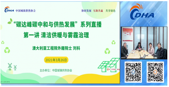 2021年3月26日下午,“‘碳達(dá)峰碳中和與供熱發(fā)展’系列直播第一講:清潔供暖與霧霾治理”通過(guò)網(wǎng)絡(luò)直播的形式成功舉辦,在線觀看人數(shù)近兩千人,供熱企業(yè)紛紛組織員工集體觀看,加上集體組織觀看人數(shù)約有上萬(wàn)人!