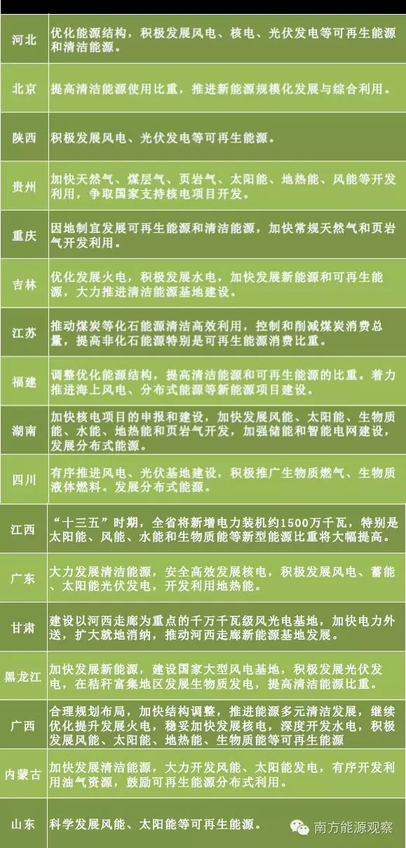 國家“十三五”規(guī)劃建議提出建設(shè)“建設(shè)清潔低碳、安全高效的現(xiàn)代能源體系”,并要求加快發(fā)展風(fēng)能、太陽能、生物質(zhì)能、水能、地?zé)崮?,安全高效發(fā)展核電。在各省的規(guī)劃建議中,發(fā)展清潔能源也是一項(xiàng)重點(diǎn)工作。風(fēng)電、光伏發(fā)電、太陽能是各省重點(diǎn)發(fā)展的新能源,不同省份根據(jù)資源稟賦,選擇發(fā)展新能源的種類也不同,比如重慶提出“加快常規(guī)天然氣、頁巖氣的開發(fā)利用”;福建“著力推進(jìn)海上風(fēng)電、分布式能源等項(xiàng)目建設(shè)”;四川還積極“推廣生物質(zhì)燃?xì)?、生物質(zhì)液體燃料”;甘肅則提出“建設(shè)以河西走廊為重點(diǎn)的千萬千瓦級風(fēng)光電基地”,并且“加快電力輸送,擴(kuò)大就地消納”;山東對新能源發(fā)展較為保守,只提出“科學(xué)發(fā)展風(fēng)能、太陽能等資源”。