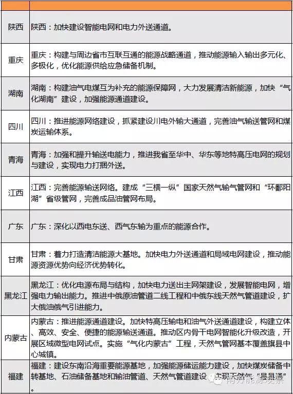 陜西、重慶、湖南、四川、青海、甘肅、內(nèi)蒙古均提出加快能源通道建設(shè),主要為電力外送通道,部分省份還提出加快油氣輸送管網(wǎng)和煤炭運(yùn)輸通道建設(shè)。