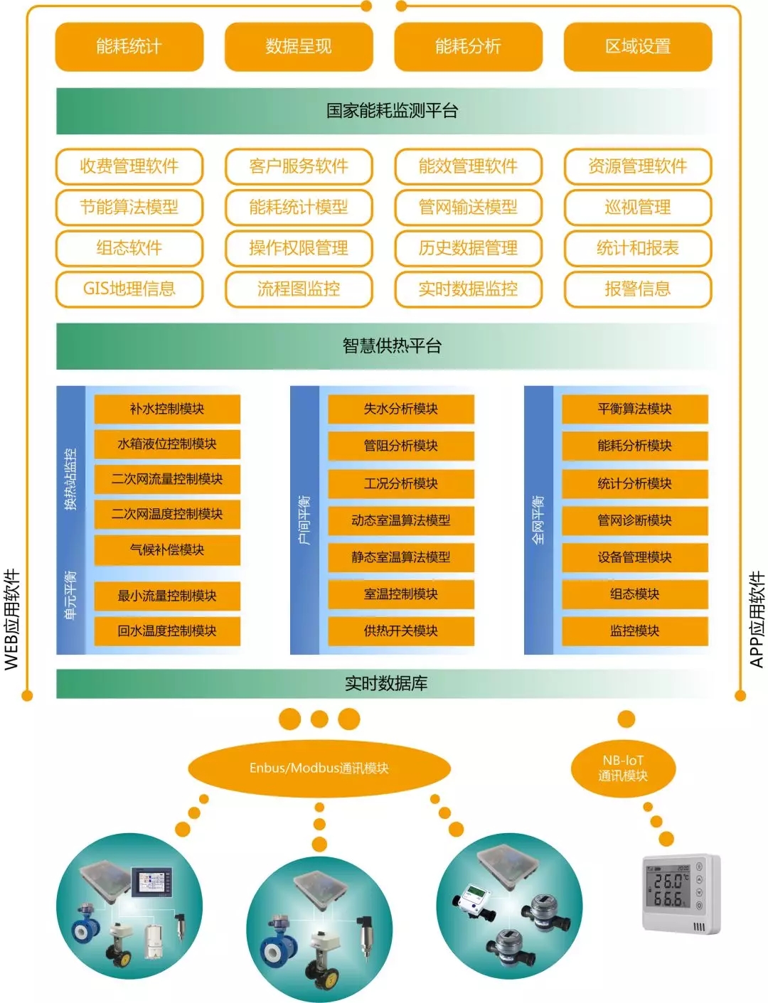 智慧供熱系統(tǒng)由應用系統(tǒng)、數據系統(tǒng)、通信系統(tǒng)和平衡系統(tǒng)等子系統(tǒng)構成。通過換熱站平衡、單元和樓棟平衡和戶間平衡三個層級的熱平衡技術,同時結合手機APP交互平臺、WEB交互平臺,以及節(jié)能優(yōu)化系統(tǒng)、管路診斷系統(tǒng)、能耗分析系統(tǒng)、設備管理系統(tǒng)、統(tǒng)計報表系統(tǒng)等,以個性供熱、舒適供熱為目標,對供熱系統(tǒng)進行全數字化的監(jiān)控和高度智能化的管理,實現系統(tǒng)監(jiān)控、節(jié)能降耗、客戶管理、人員管理、設備管理、資源管理等綜合管理功能,從而提升熱網運行的綜合效益。
