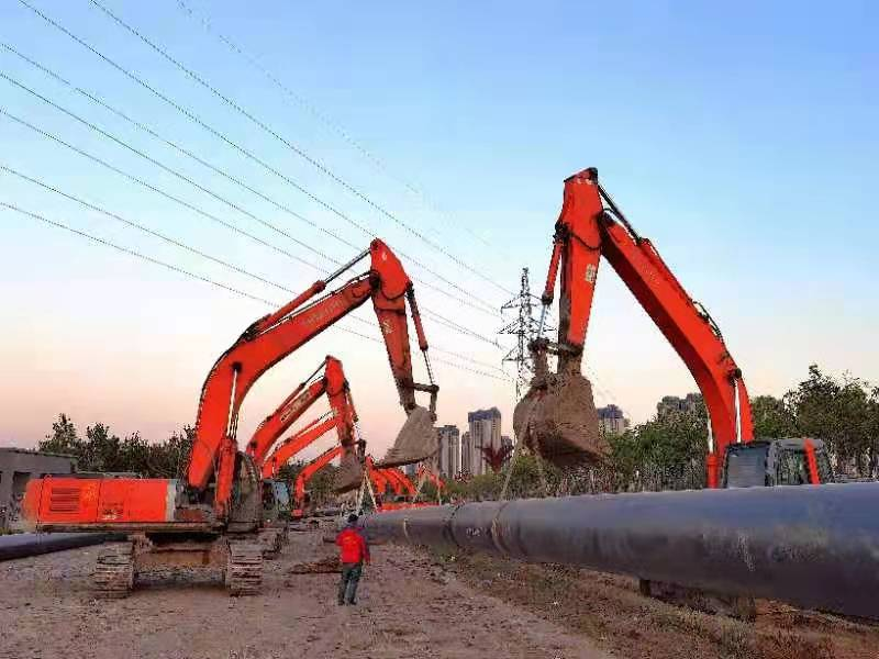 施工現(xiàn)場,數(shù)十名施工人員在溝槽內(nèi),或焊接、或打磨、或保溫補(bǔ)口,一派忙碌,即使深夜依然燈火通明、熱鬧非凡,每天挖掘機(jī)、裝載機(jī)、起重機(jī)、發(fā)電機(jī)、電焊機(jī)等近百臺施工設(shè)備“白加黑”“5+2”不停運(yùn)轉(zhuǎn),錯落有致地忙碌在項目現(xiàn)場。各類設(shè)備的轟鳴聲按照各自的節(jié)拍和音調(diào),混合了時隱時現(xiàn)的焊接火花,共同奏出了一首具備聲光電立體效果的搶進(jìn)度、保民生的現(xiàn)代交響曲。建設(shè)、施工、監(jiān)理、設(shè)計、供應(yīng)商等項目相關(guān)單位的工作人員奔走于各管段之間,緊張而有序地推動著現(xiàn)場施工的進(jìn)度。