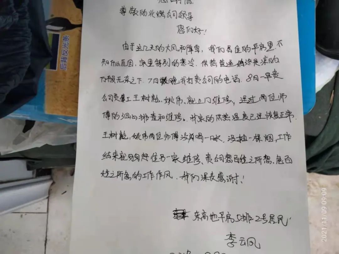 北燃供熱豐臺分公司“五星維修技師”團隊全力以赴迎戰(zhàn)寒潮保供暖。11月9日,北燃供熱豐臺分公司收到了來自東高地平房5排2號居民的感謝信。原來,受大風降雪惡劣天氣影響,住戶家中體感寒冷,撥打了北燃供熱服務報修電話。維修人員上門檢查后,逐步排查問題,并以最快速度解決問題,獲得用戶肯定。