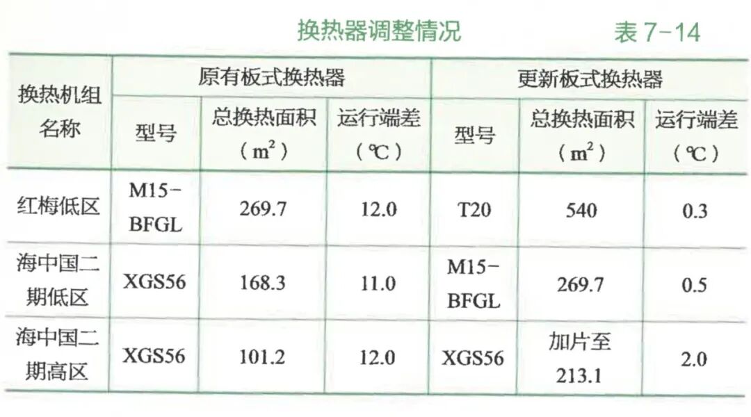 此外,由于海中國(guó)二期低區(qū)、高區(qū)供熱機(jī)組板式換熱器型號(hào)相同,利用低區(qū)供熱機(jī)組拆下的三臺(tái)XGS56換熱器的部分板片對(duì)高區(qū)機(jī)組進(jìn)行換熱器加片,使其總換熱面積由101.2㎡增加到213.1㎡,取得了良好的換熱效果與節(jié)電效果。換熱器調(diào)整情況見表7-14。