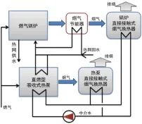 為充分挖掘燃?xì)忮仩t潛力,采用燃?xì)怛?qū)動吸收式熱泵直接接觸換熱煙氣余熱回收技術(shù)回收尾部煙氣熱量(見圖1),鍋爐排煙溫度降至25-30℃,效率提升約10%,氮氧化物降低約8%,同時(shí),可實(shí)現(xiàn)鍋爐煙氣“消白”和冷凝水回收利用。